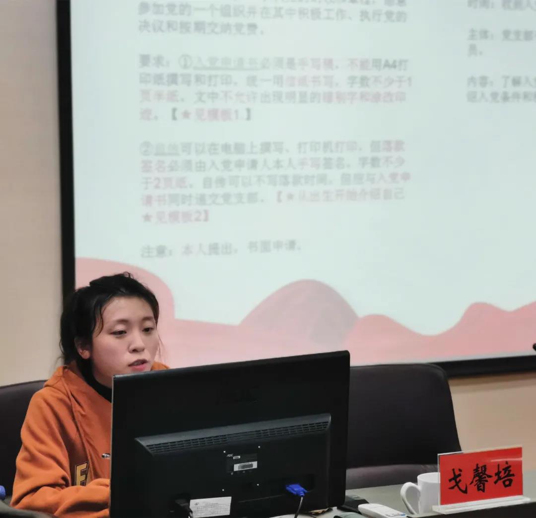 會議最后戈馨培同志為準備加入黨組織的同志詳細講解了入黨流程、入黨申請書規范格式和注意事項。